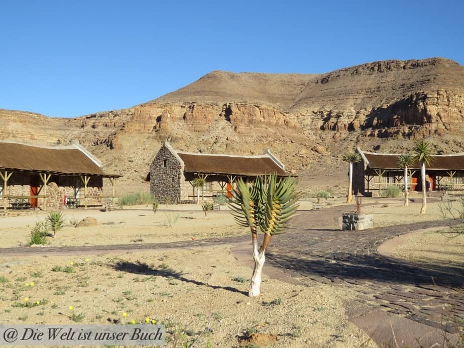 Die Lodge selbst ist wie ein kleines Dorf aufgebaut – viele einzelne, strohgedeckte Chalets, verteilt zwischen Granitfelsen und Trockenbüschen, verbunden durch kleine Wege aus Naturstein. Jedes Häuschen trägt den Namen einer namibischen Persönlichkeit oder Siedlung und hat von der Veranda aus freien Blick auf die Landschaft.